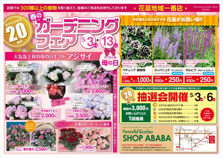 ペレニアルガーデンShop ABABA 「春のガーデニング全力サポート宣言!!」と題して、 春のガーデニングフェア & 母の日ギフト フェアを 5/3(水)~5/7(日)の5日間開催いたします。 スタッフ一同、全力で皆様 […] -
