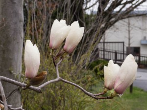 昨年末にも紹介しましたが、十月桜の春のお花が咲き始めています。ソメイヨシノに比べると早咲きなので、あいにくの雪模様に。