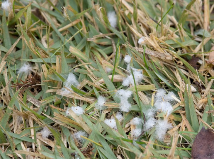 芝生の上に積もった粉雪かな? と近づいてみると、朝露に濡れたシュウメイギクのタネでした。コットンシードのように綿毛をまとっています。
