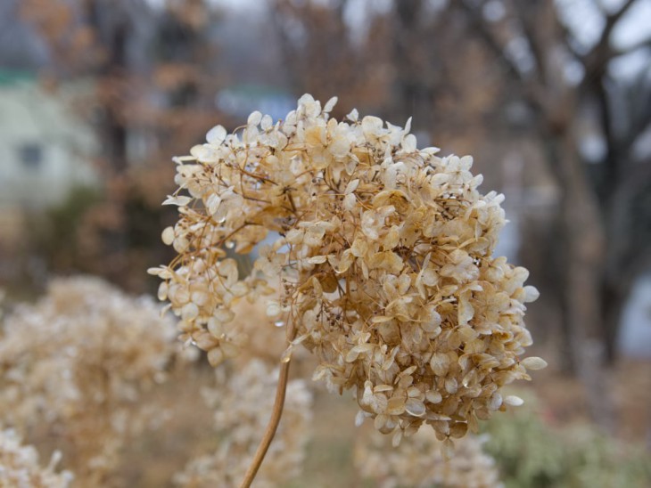 整枝作業までの晩秋から春先は、枯れた枝先の花がらはそのままにしています。天然のドライフラワーというわけです。晴れた日に風が吹くと、カサカサという小さな音が聞こえてきて、なんとも言えない風情を感じます。
