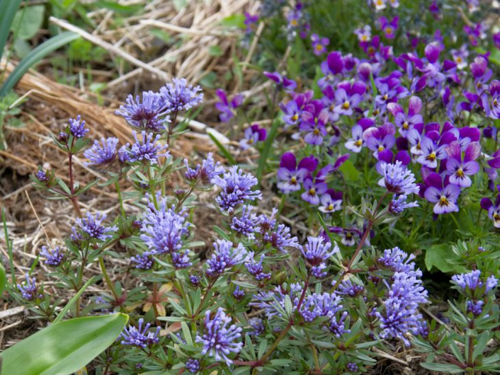アスペルラ・オリエンタリスと可愛らしいビオラのコラボレーションです。どちらも一年草として扱われますが、共に夏になると枯れてしまう点は同じです。