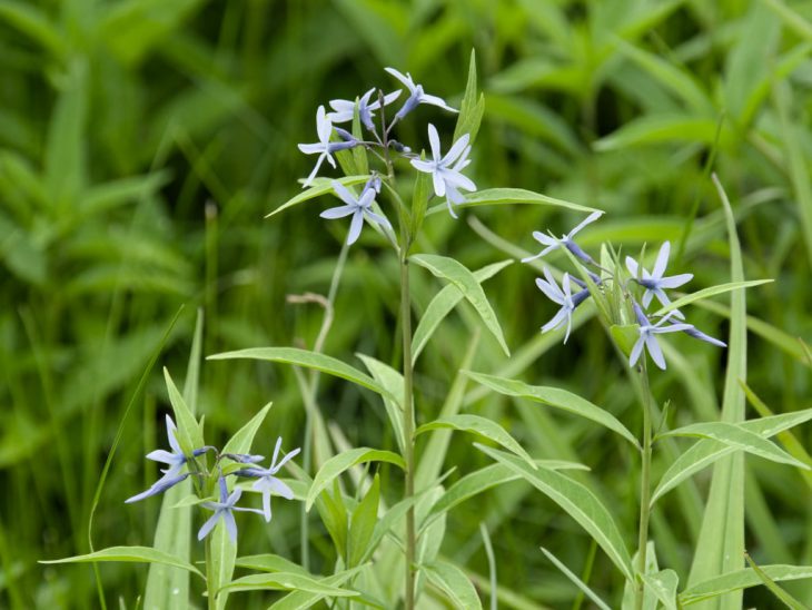 北米原産種にくらべると背が低く、お花の数も少ないので貧相な感じがするかもしれません。ただ、頂点で咲く性質なのでお花が良く映える目立つ咲き方です。ホソバチョウジソウやヤナギバチョウジソウは、つぼみの上に側枝が伸びてから咲くので、お花が茎の中で咲いている状態になります。
