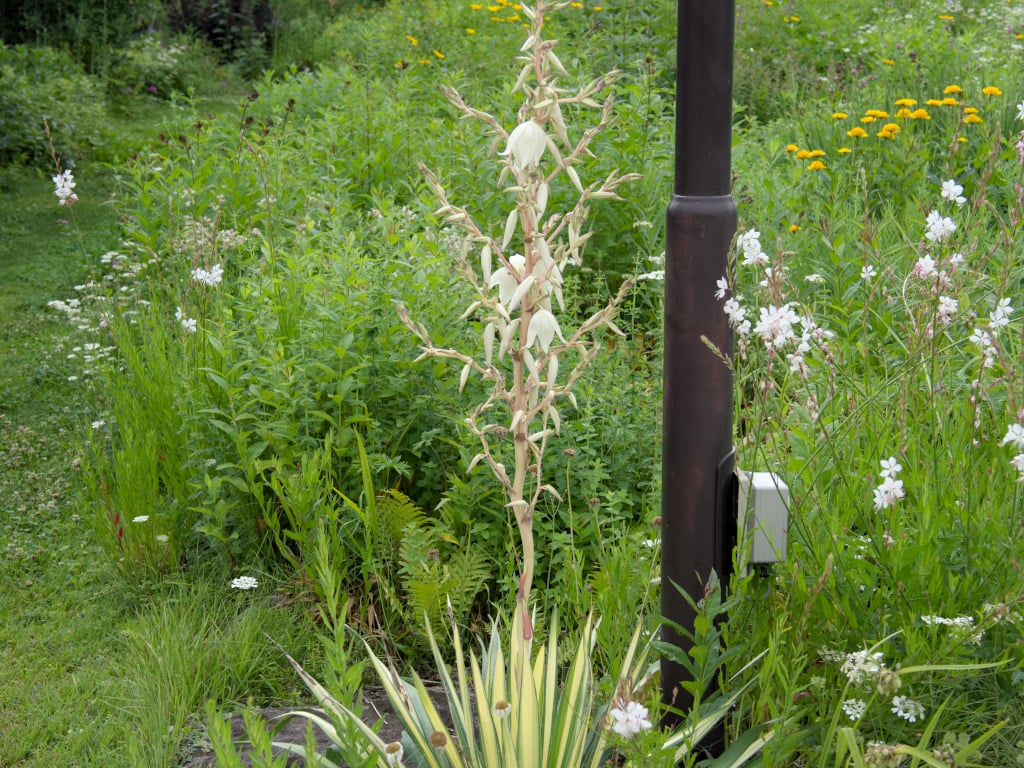 キミガヨランと同じユッカの仲間で、耐寒性の高いガーデン向きの多肉植物です。成熟した株はお花を咲かせますが、開花には何年もかかることが多くて、2016年の11月に紹介したこちらの株がようやく咲きました。