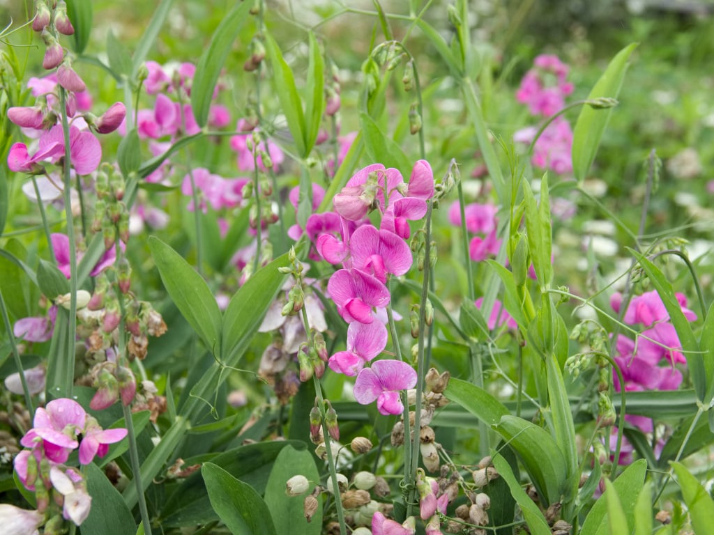 サマースイートピーの名前の通り、宿根スイートピーは初夏が開花の中心になります。咲き始めはかなり早くて、越冬した株なら五月の連休前から咲き始めます。春はお花の数も多くなく、ポツポツと咲いている程度ですが、梅雨を迎える時期からは枝先のほとんどにお花を咲かせます。