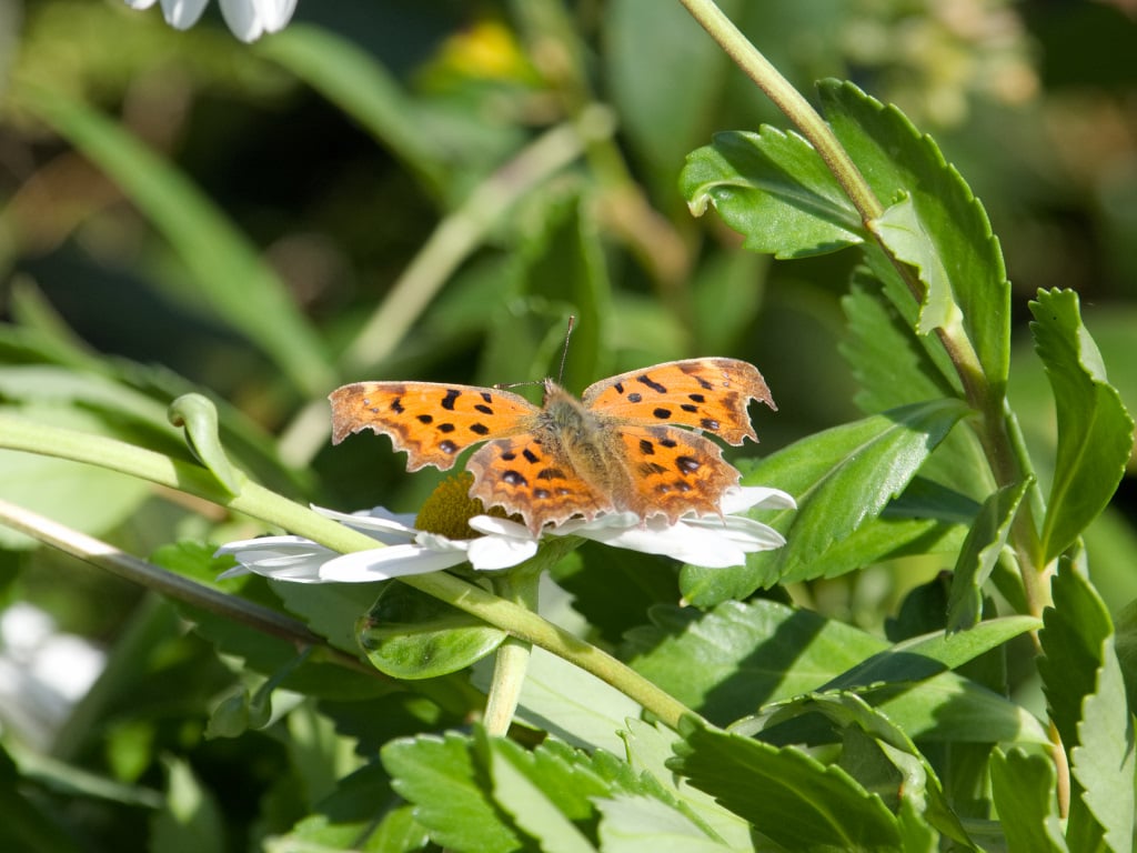 以前にも紹介した「キタテハの秋型」です。今年は翅を開いて止まっている姿を撮れました。風が強い日や気温が高い日は閉じていることが多いので、アンティークオレンジの秋色を見られるのは少し肌寒いくらいの穏やかな日です。