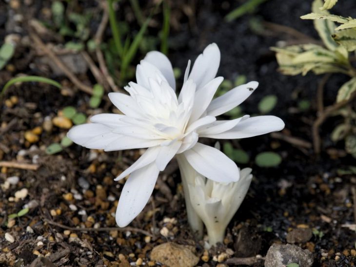 コルチカムのピンクの八重咲きは普及してきましたが、純白の八重咲きはまだ珍しいものです。ピンクの八重咲き「ウォーターリリー」よりは少し小ぶりで、ペレニアルガーデンでは遅れて咲き始めました。