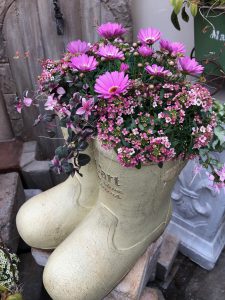 ブーツ型の鉢に春をギュギュっと詰め込んで(^^♪