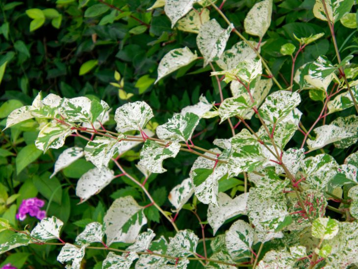 イタドリは、春の山菜としても親しまれている日本の野草です。斑入りの種類は古くから草物盆栽に人気があって、身近な鉢植えとして園芸化されていました。