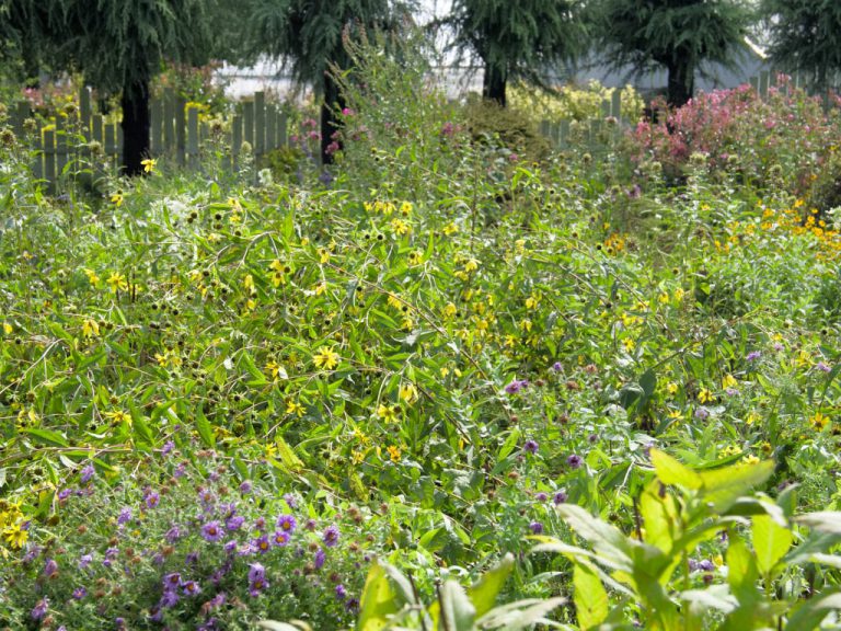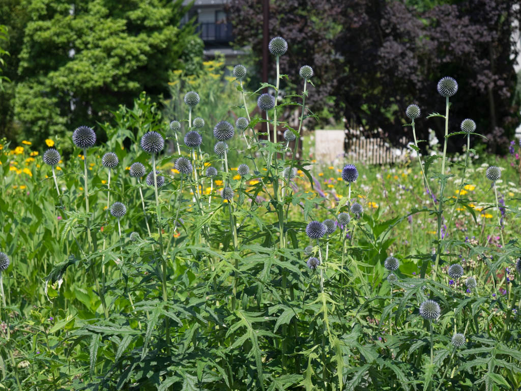 宿根ルピナスやノボリフジ(昇藤)、ハウチワマメとも呼ばれる耐寒性宿根草で、暑さに弱いので暖地では夏に枯れる一年草として扱われています。幸い小渕沢では夏に枯れることはめったにないので、宿根草として毎年大株に育っています。青紫のお花を見ていると、まさに逆さまにした藤の花のように見えてきます。